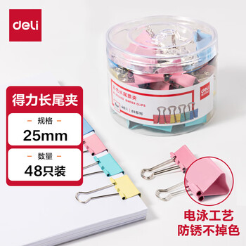 得力(deli)48只25mm彩色长尾夹票夹4#中号金属燕尾夹票据文件夹子办公用品48只/筒8554ES