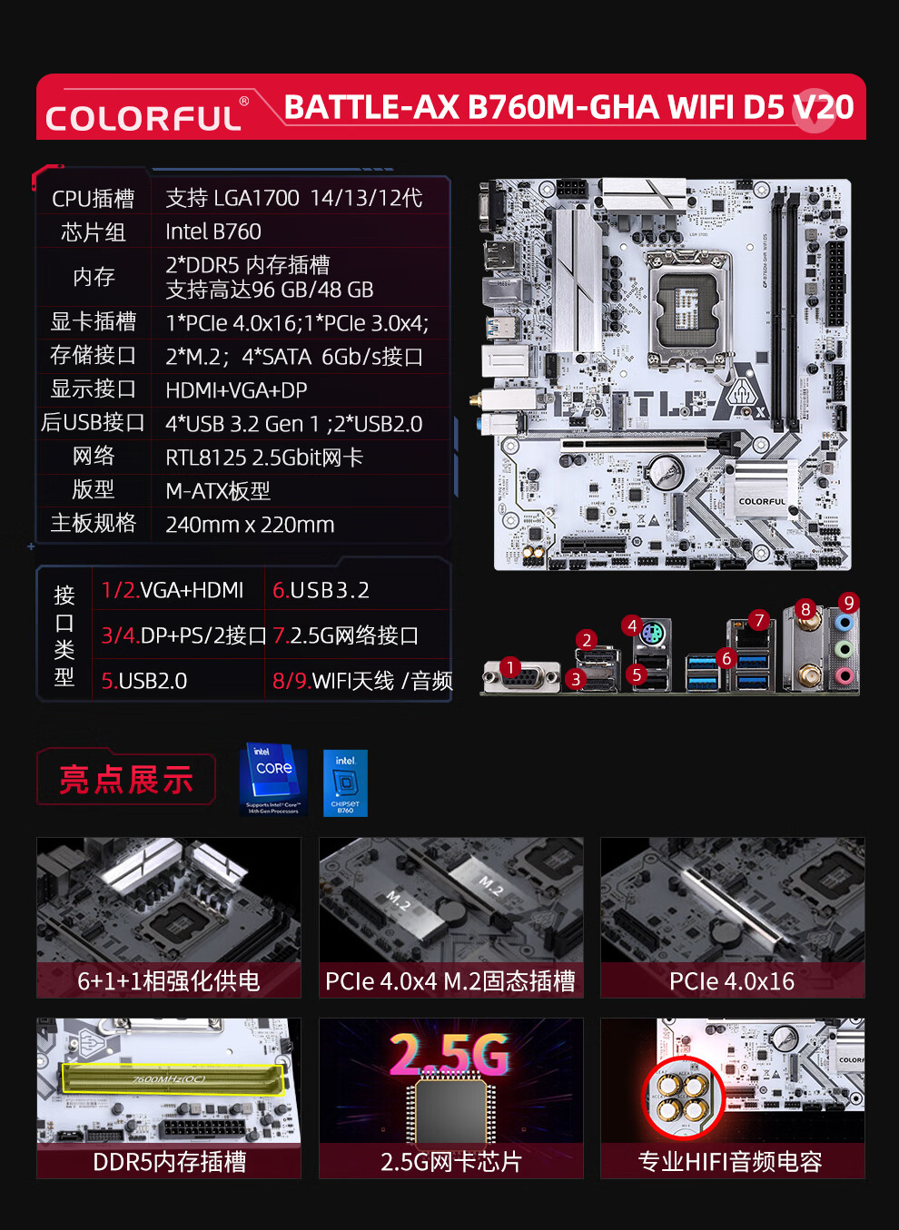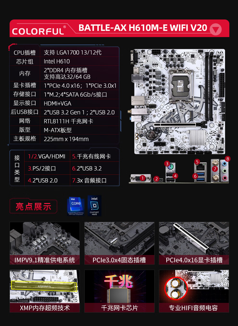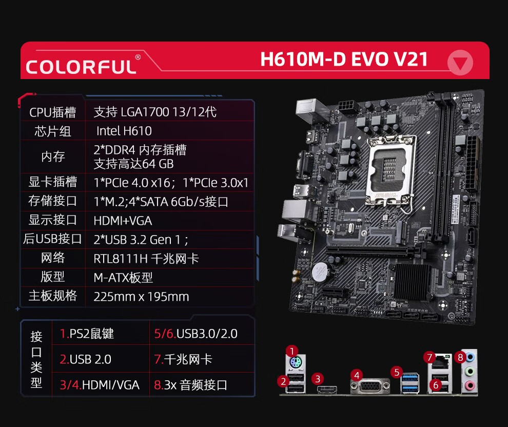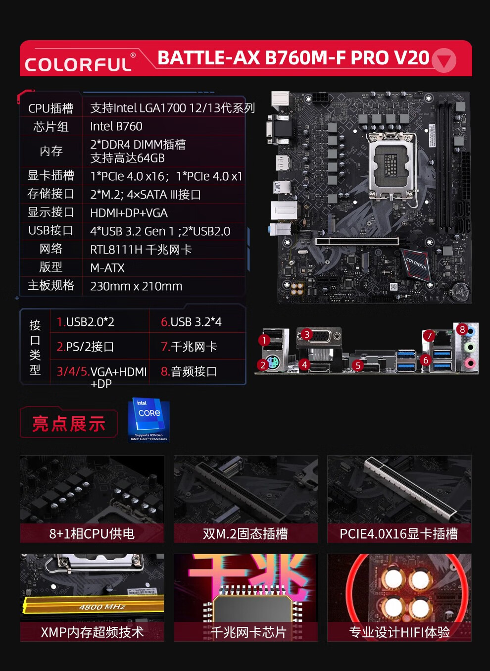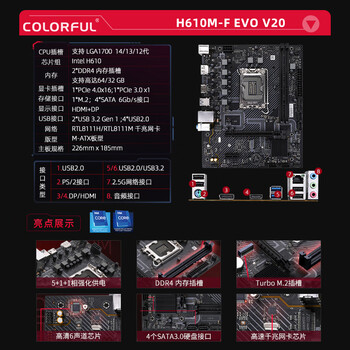 七彩虹(Colorful)英特尔(Intel)七彩虹Z790主板搭12/13代i513490F13600KF板u套装H610M-FEVOD4板u套装12代丨i512490F【6核