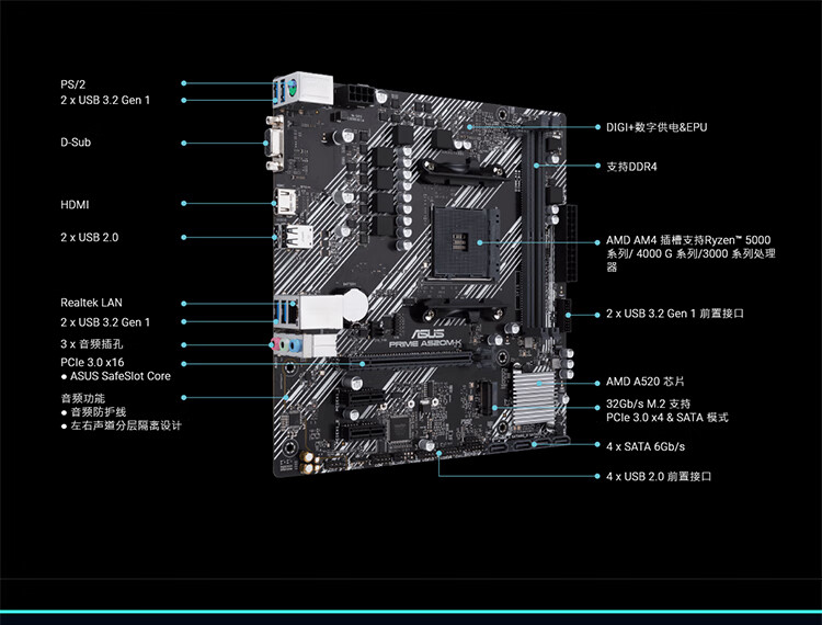 AMD锐龙R55600G搭华硕PRIMEA520M-K板U套装CPU主板套装