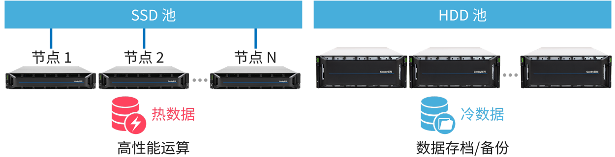 Cenby新邦SW3012 CS 通过混合配置实现存储的g效率。CS 集群可以在 SSD 节点、HDD 节点、扩展柜之间灵活组合。基于混合架构,将经常使用的“热数据”保留在 SSD 上,将较少访问的数据保留在 HDD,充分利用 SD 的速度和 HDD 的低价格。