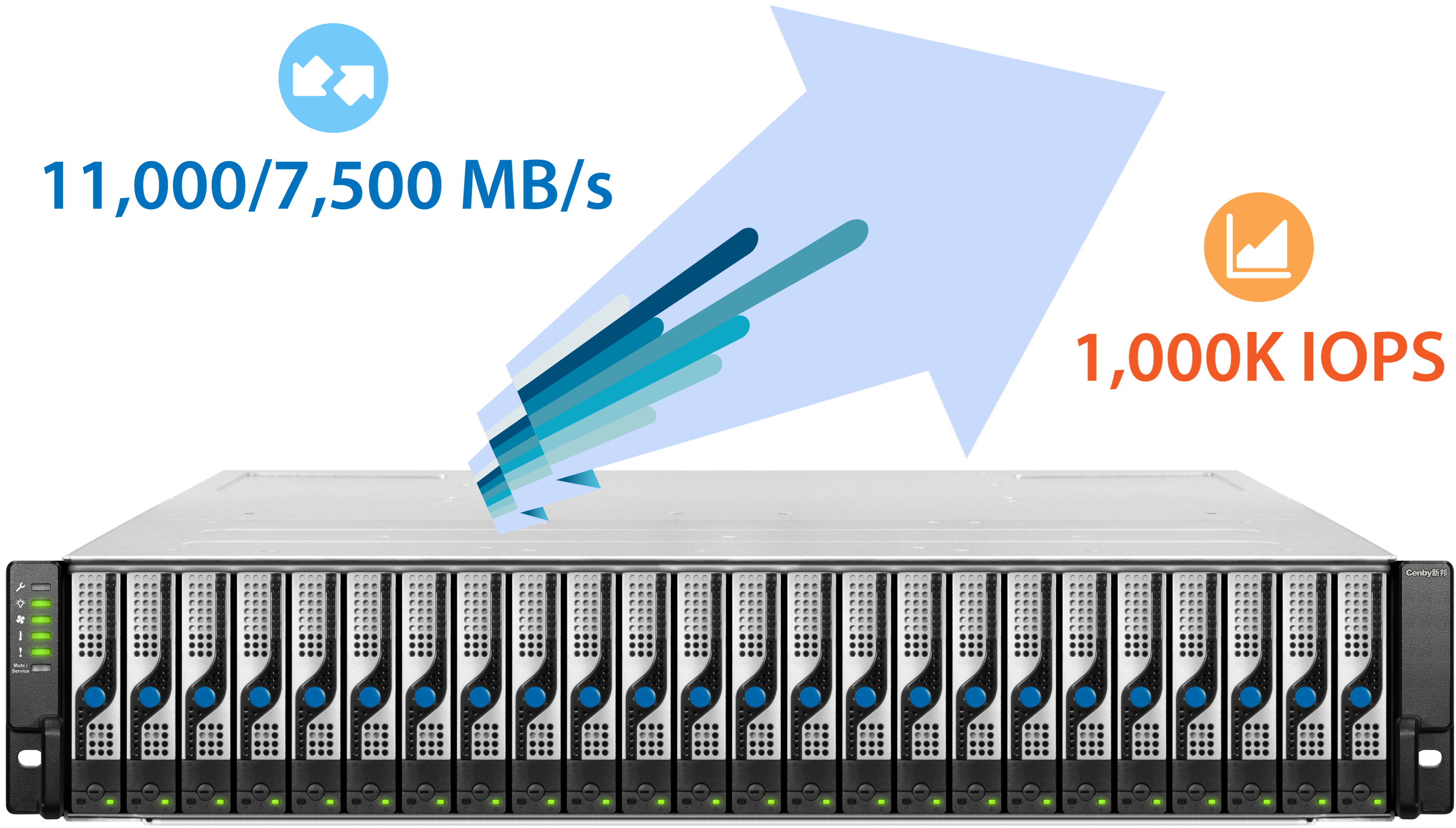 Cenby新邦 DS 提供多种高速协议,例如 32Gb/s FC 和 40Gb/s iSCSI。读写速度可达 11/7.5 GB/s,1000K IOPS,十分适合企业级服务器架构,处理各种企业关键应用和 IT 部署环境。