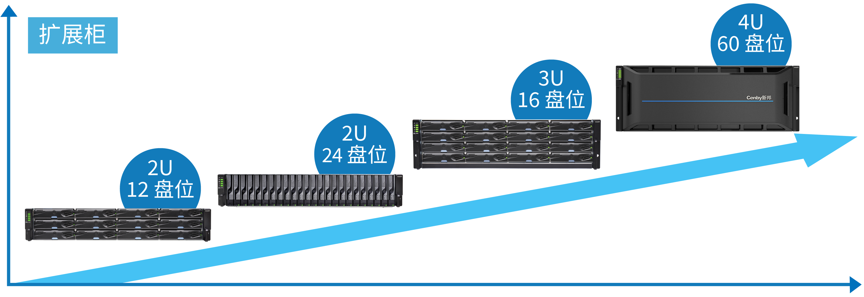 Cenby新邦 DS 提供 2U 12 盘位、4U 60 盘位、3U 16 盘位、4U 60 盘位等多种规格扩展柜,可支持 448 颗硬盘容量达到 PB 级。