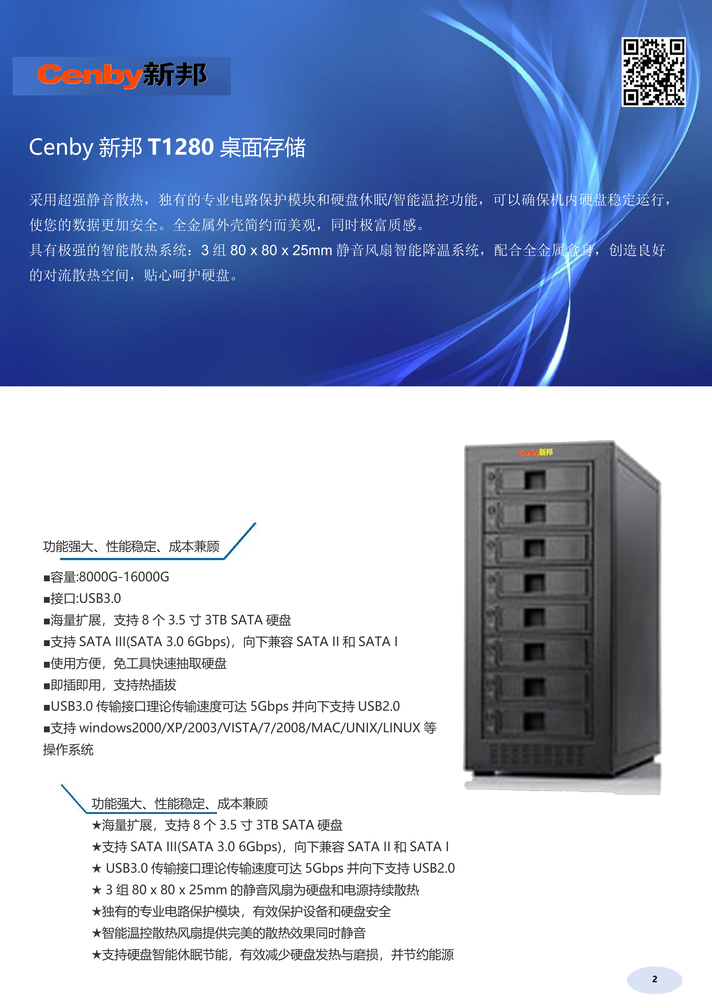 Cenby新邦 T1280(极速阵列安全型升级版)桌面存储采用超强静音散热,独有的专业电路保护模块和硬盘休眠/智能温控功能,可以确保机内硬盘稳定运行,使您的数据更加安全。全金属外壳简约而美观,同时极富质感。