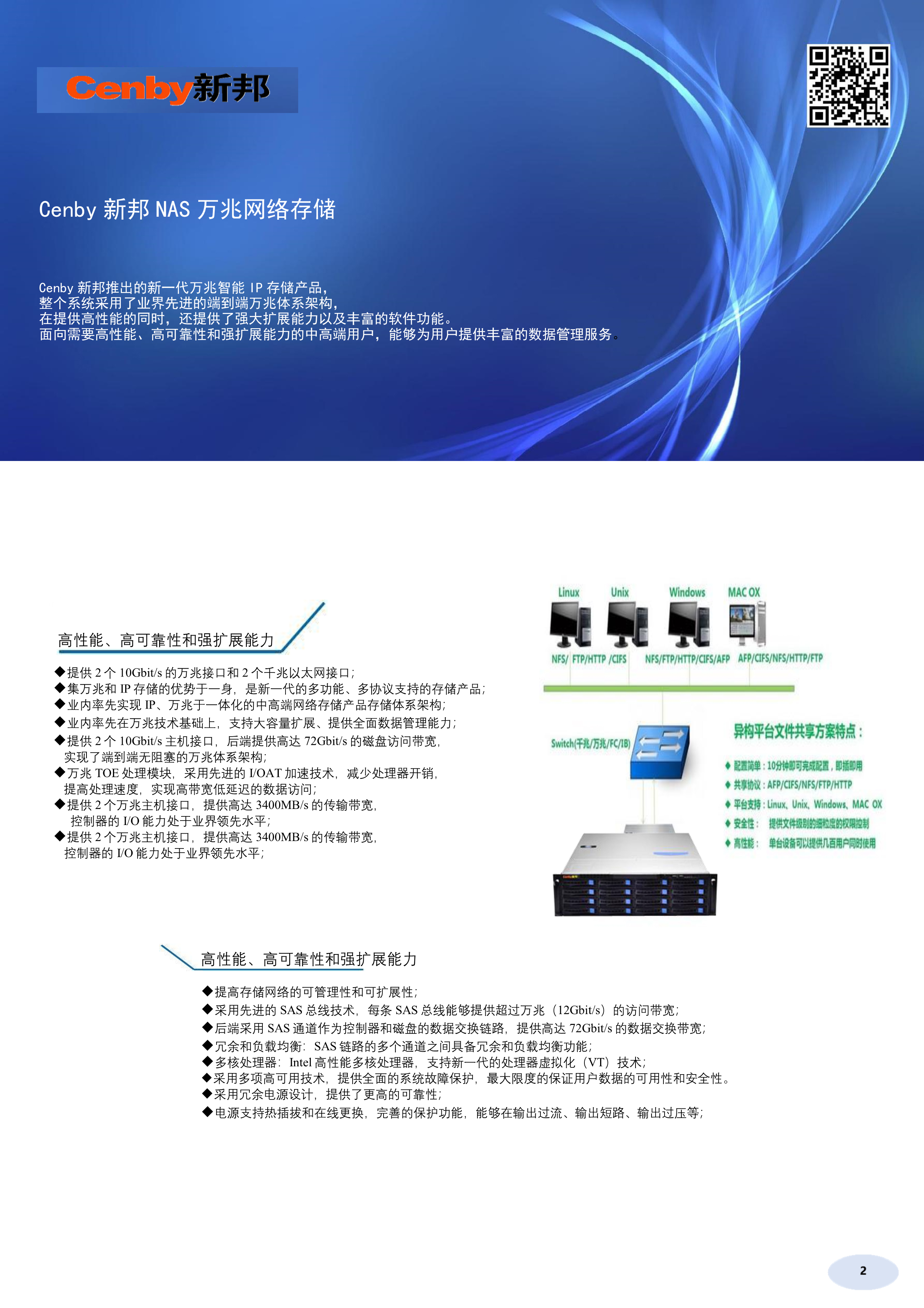 Cenby新邦推出的新一代万兆智能IP存储产品,整个系统采用了业界领先的端到端万兆体系架构,在提供高性能的同时,还提供了强大扩展能力以及丰富的软件功能。面向需要高性能、高可靠性和强扩展能力的中高端用户,能够为用户提供丰富的数据管理服务。