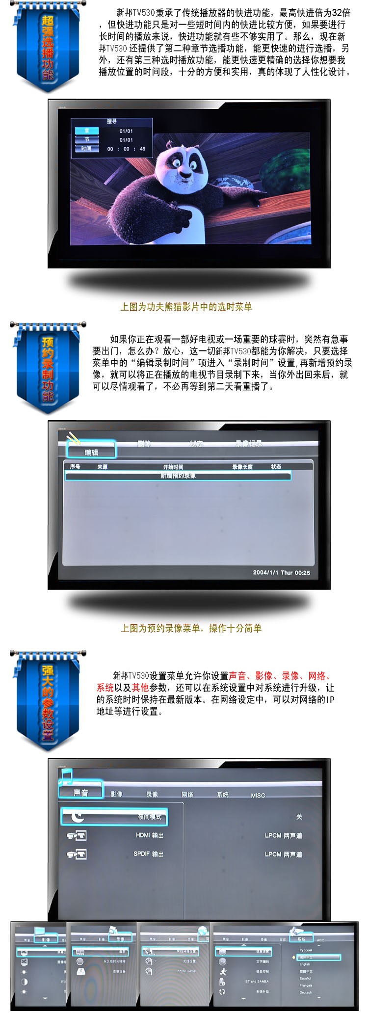 别抢遥控器了!在各自屋里也能欣赏Cenby新邦 TV530(电视录制NAS型)移动硬盘中的大片和其中所录制的电视节目!你还在狭小的电脑屏幕上欣赏刚下载的大片吗?是不是感觉有些窒息?原本期望的震撼感觉荡然无存,剩下的就只是糟糕的图像和嘈杂的音响。你又是不是因经不住网络资源的诱惑而期盼久违了的那种与家人一起在宽敞的客厅里,坐在舒适的沙发上,品着浓郁的咖啡,清淡的香茶,共享影视大餐的快乐与温馨?