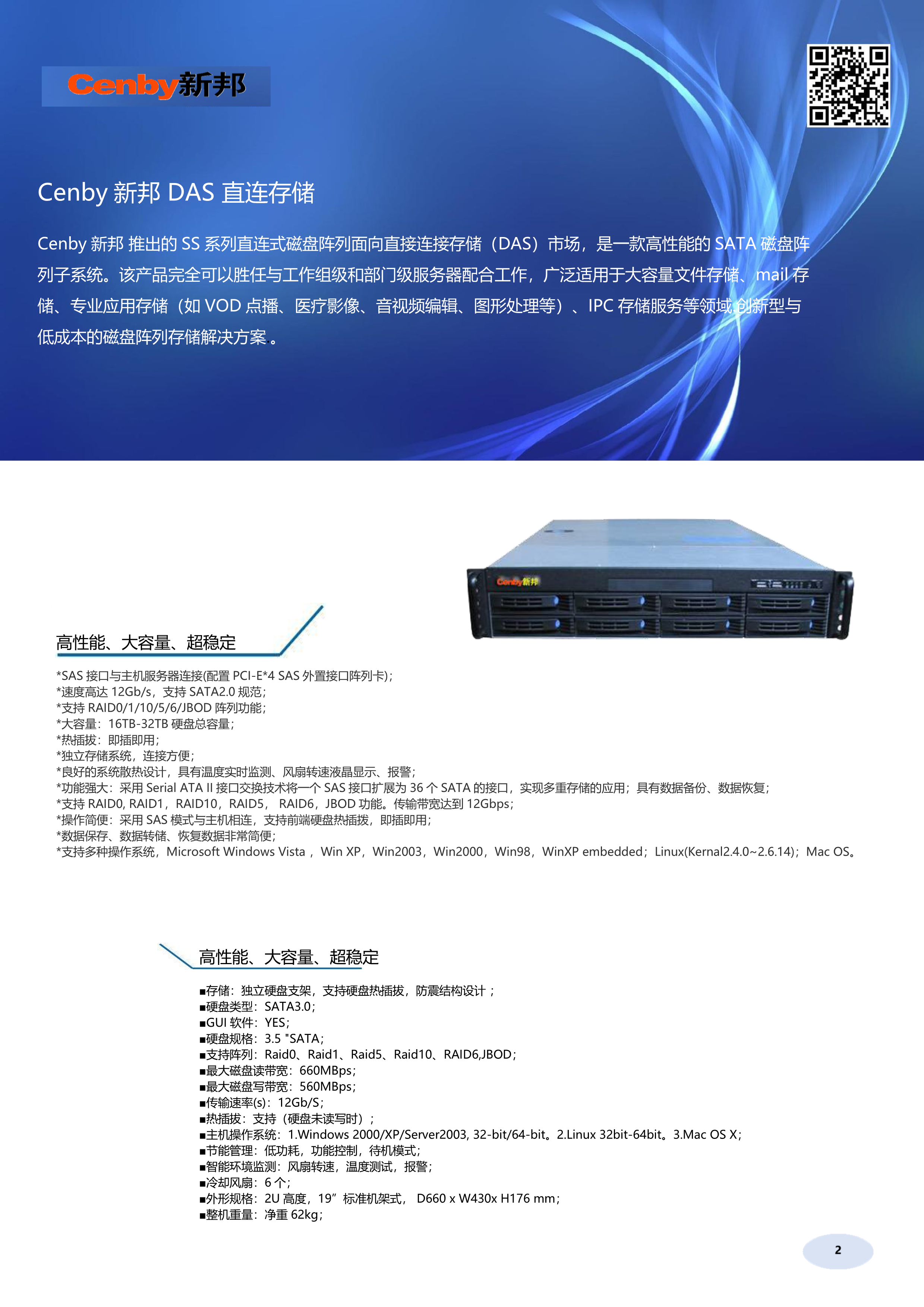 Cenby新邦 推出的SS系列直连式磁盘阵列面向直接连接存储(DAS)市场,是一款高性能的SATA磁盘阵列子系统。该产品完全可以胜任与工作组级和部门级服务器配合工作,广泛适用于大容量文件存储、mail存储、专业应用存储(如VOD点播、医疗影像、音视频编辑、图形处理等)、IPC存储服务等领域.创新型与低成本的磁盘阵列存储解决方案;