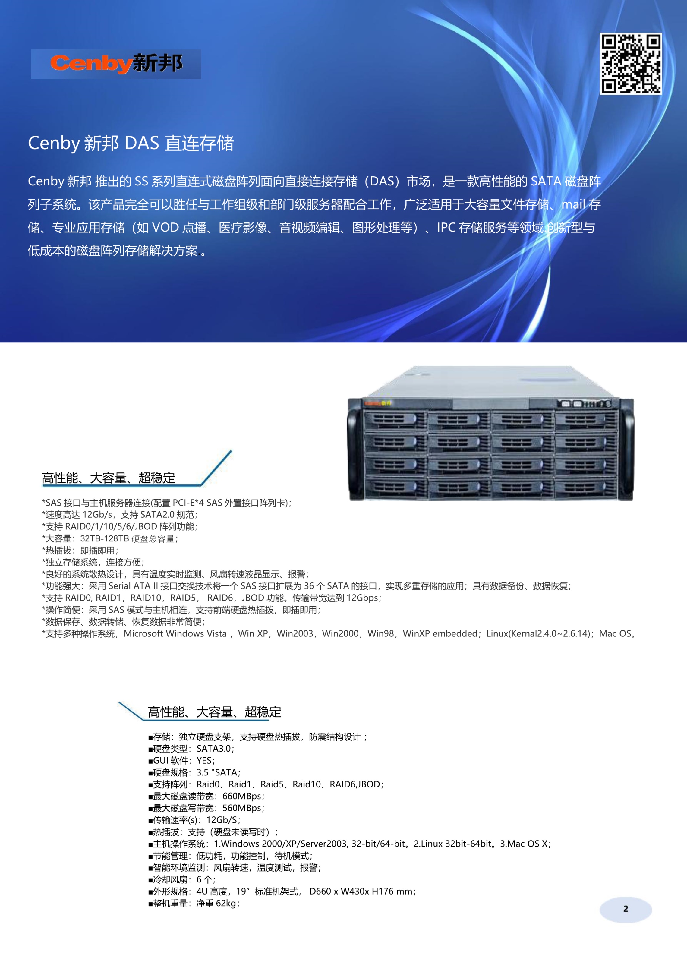 Cenby新邦 推出的SS系列直连式磁盘阵列面向直接连接存储(DAS)市场,是一款高性能的SATA磁盘阵列子系统。该产品完全可以胜任与工作组级和部门级服务器配合工作,广泛适用于大容量文件存储、mail存储、专业应用存储(如VOD点播、医疗影像、音视频编辑、图形处理等)、IPC存储服务等领域.创新型与低成本的磁盘阵列存储解决方案;