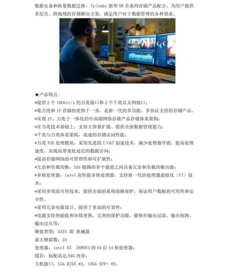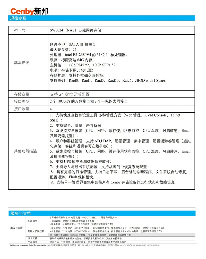 ¥800000.00Cenby新邦 NS-401S 统一存储设备(全闪) 4U24 盘位 双控制器 国产海光16核 128GB 缓存 万兆 + 千兆接口 企业级数据存储