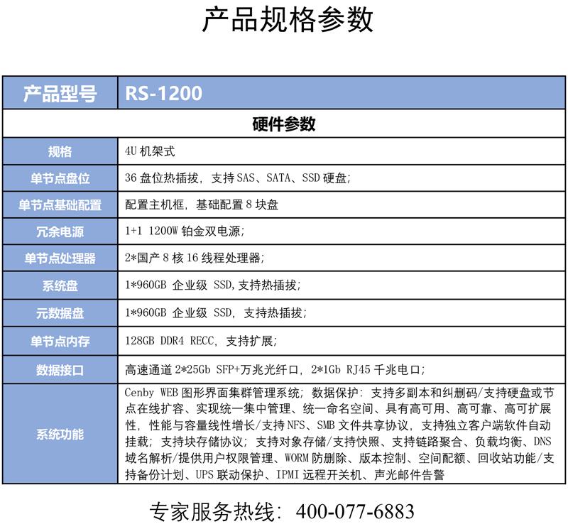 Cenby新邦RS-1200分布式存储(混闪款)4U36 盘位 双国产 8 核 128GB 缓存 25Gb 万兆光纤口 企业级集群存储 自营